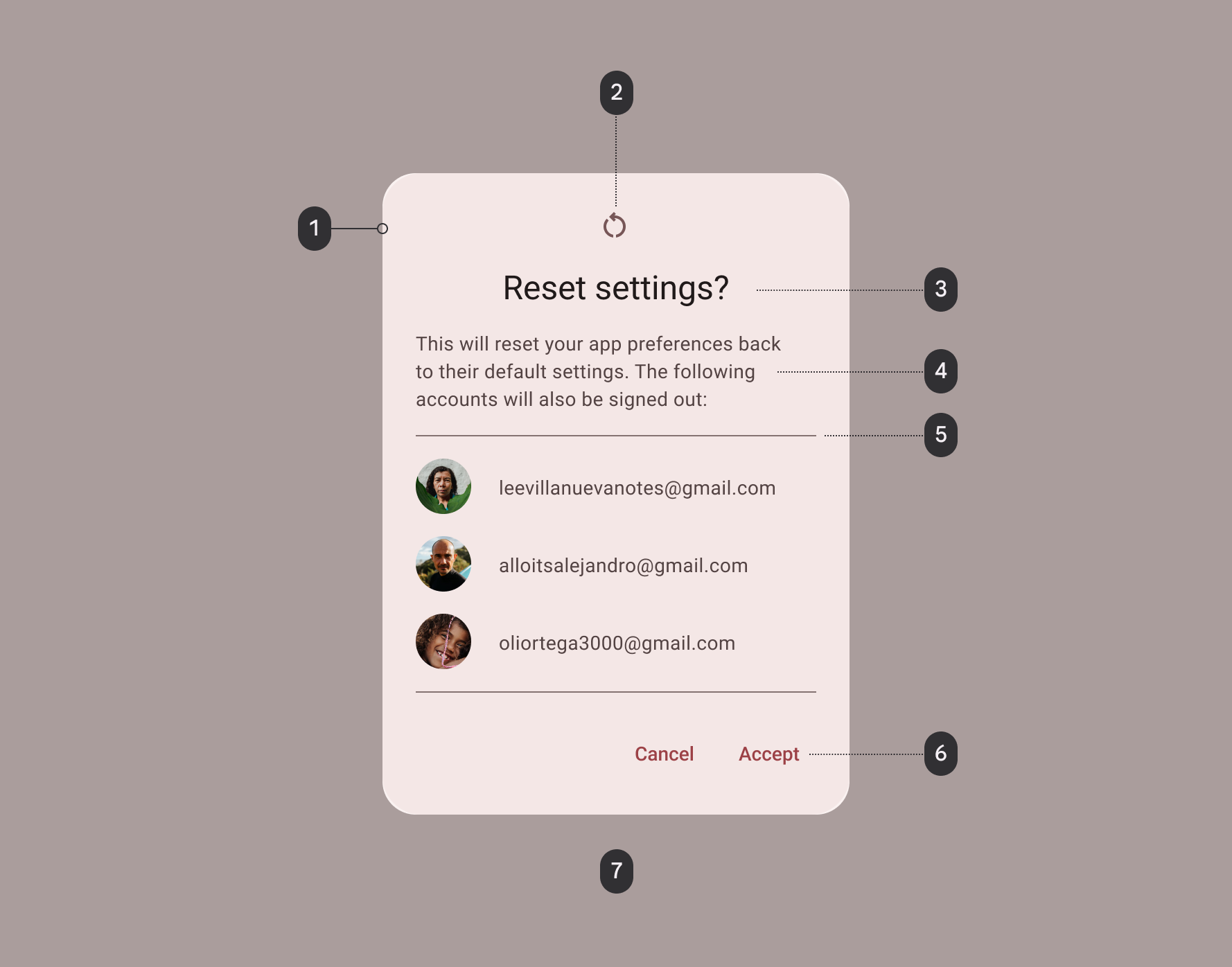 왼쪽UI Use dialogs for prompts that block an app’s normal operation, and for critical information that requires a specific user task, decision, or acknowledgement