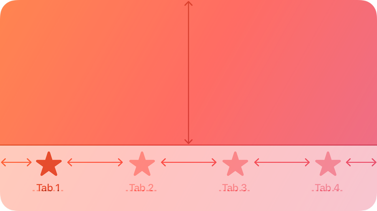 M2: 드롭 섀도우로 표시된 것처럼 네비게이션 바는 페이지 콘텐츠 위에 위치합니다. 채워진 무게 아이콘과 정규 무게 아이콘은 활성 상태를 나타내고, 정규 윤곽 아이콘은 비활성 상태를 나타냅니다.