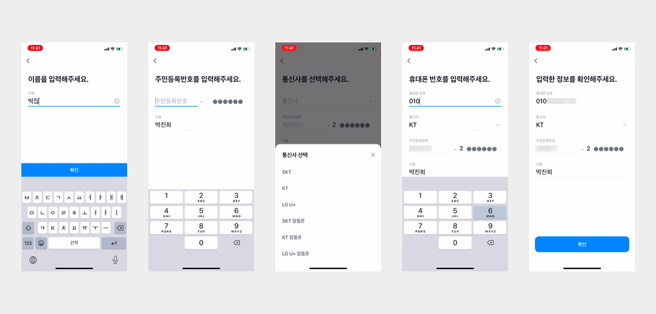 - 회원가입에 필요한 정보를 한 번에 노출하고 입력을 받을 수도 있지만 입력 폼을 단계적으로 노출하여 사용자의 부하를 낮춥니다.
