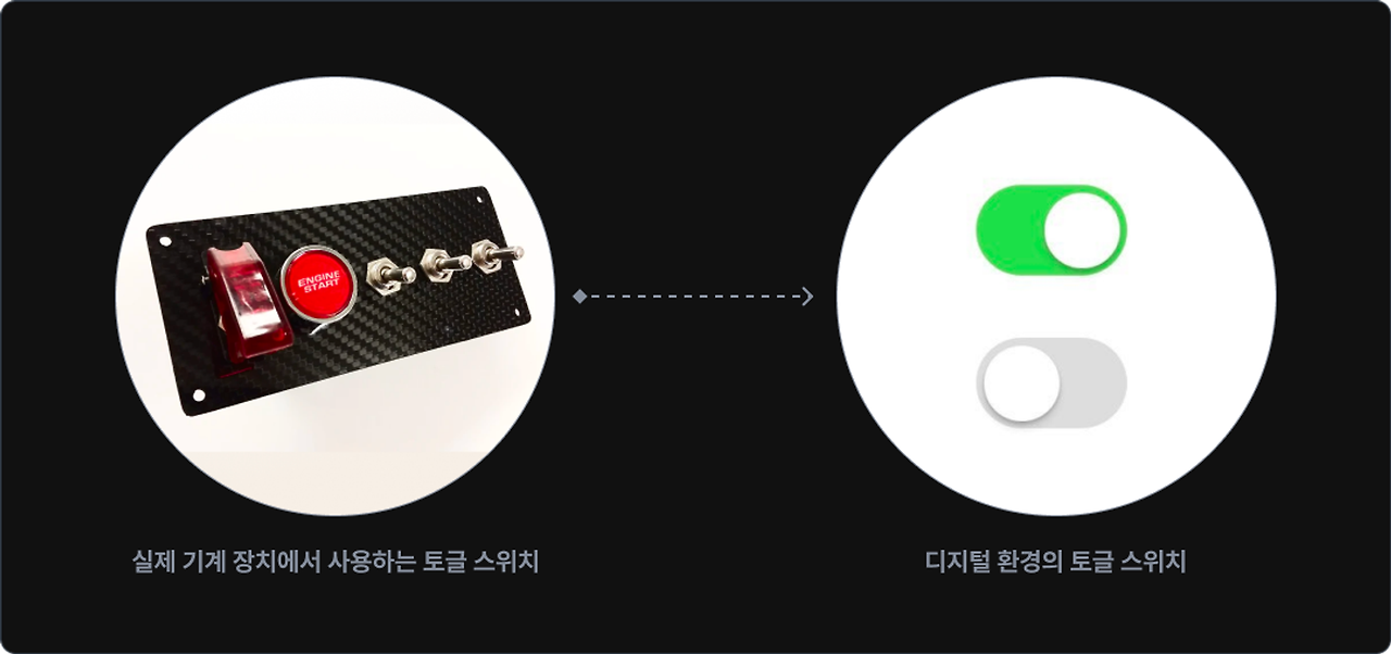 스큐어모피즘 온오프하는 UI를 그대로 옮겨온거1주 차에 배운 스큐어모피즘 양식이 제이콥 법칙의 대표적인 사례예요.- 나무 질감을 살린 책꽂이, 게이지와 버튼의 조작부가 실제와 비슷하게 동작하는 녹음기, 카메라 조리개를 그대로 옮겨온 카메라 등이 있습니다.