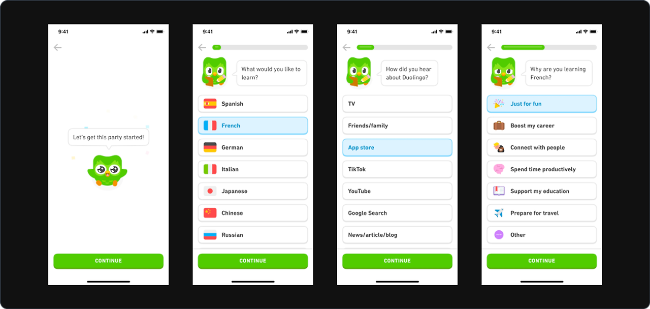 듀오링고는 언어나 레벨 관심사 선택하는 온보딩을 구성